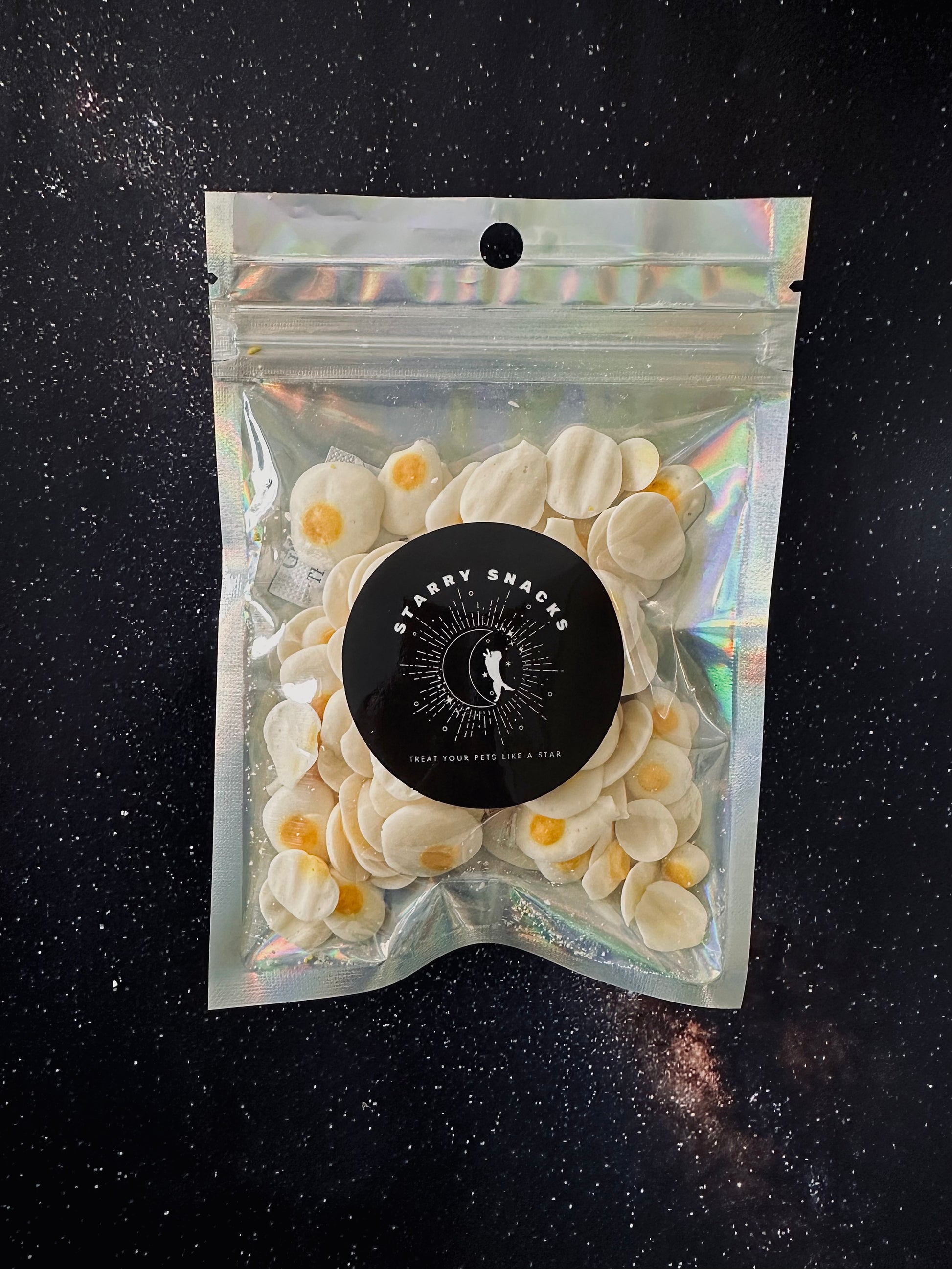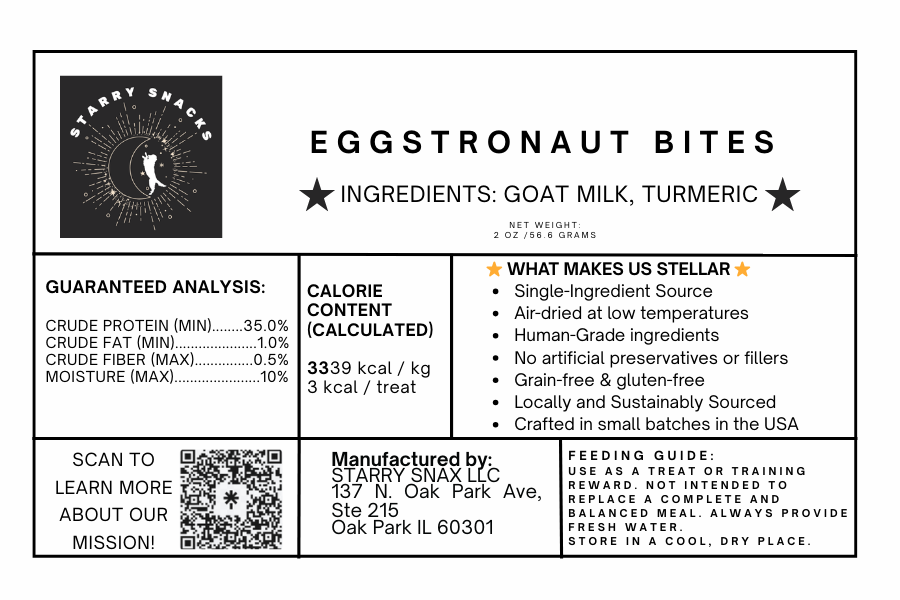 These two-ingredient treats are made with just what your pet needs for an out-of-this-world snack: high-quality, locally sourced goat milk that is infused with turmeric. I blend, and prepare each small batch myself to ensure your four-legged star gets nothing but pure, wholesome goat milk goodness. No fillers, no preservatives, no nonsense—just real ingredients, gently air-dried and packed with galactic flavor. Your pet deserves to be treated like a star!
